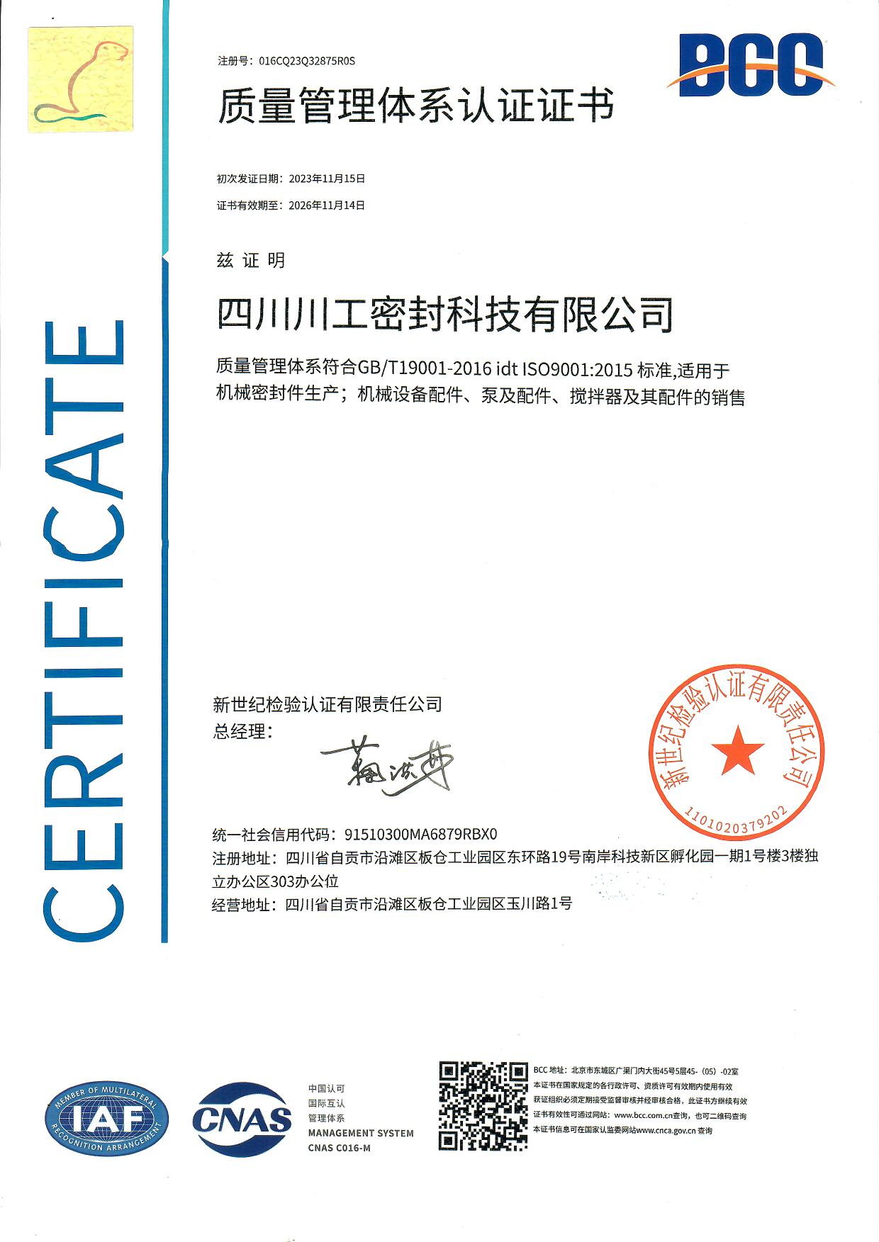 質(zhì)量管理體系認(rèn)證證書