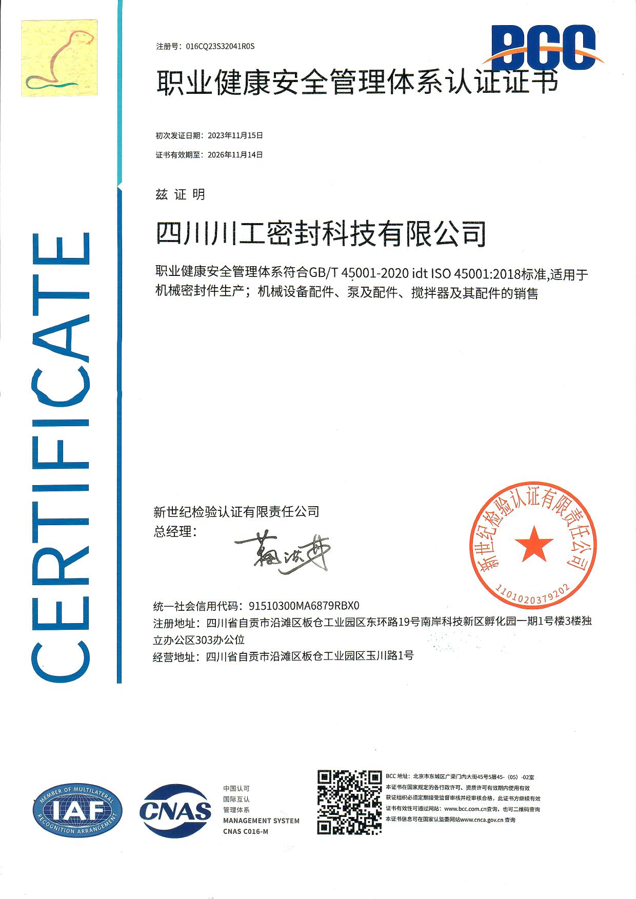 職業(yè)健康安全管理體系認(rèn)證證書